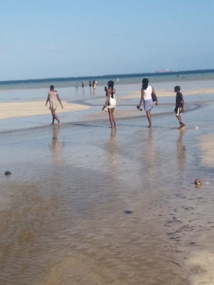 The image depicts an expansive tidal flat at Shanzu ward, Kenya, under a clear, light blue sky