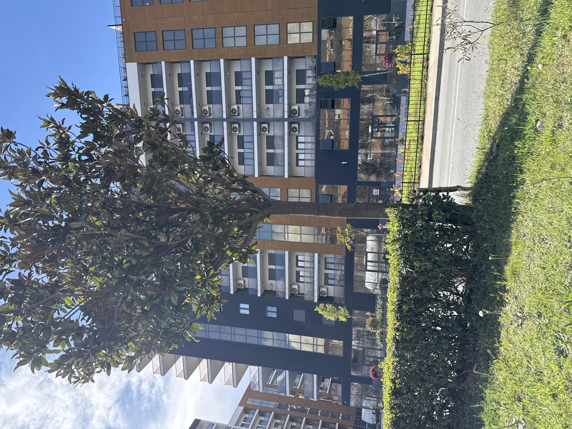 This image depicts a modern urban scene in Podgorica, Montenegro, specifically at **Bulevar Josipa Broza Tita 105**. The central focus is a multi-story residential and commercial building with contemporary architecture, viewed from an eye-level perspective under a sky featuring both clear blue and scattered white clouds. **Environment:** The scene is outdoor, with natural sunlight casting shadows, indicating bright conditions. A paved asphalt road runs horizontally across the midground, separated from the viewer's position by a low black metal fence. In the immediate foreground, a patch of vibrant green grass with scattered dandelions is visible, bordered by a dense, manicured green hedge that extends horizontally across the frame. **Subjects and Objects:** * **Building:** The prominent structure is a multi-story building featuring a mixed facade. The central section is dark grey or dark blue with large reflective glass panels and several white-paneled balconies. Each balcony is equipped with an external air conditioning unit, totaling at least six visible units on this section. To the right, a significant portion of the building presents a uniform brown brick facade with a grid of dark-framed windows. A smaller section of a similar, less detailed building with white panels is visible on the far left. The ground floor of the main building features large reflective glass windows, indicating commercial spaces. Reflections on these windows include a white commercial van and, notably, a white sign with the text "PRODAJE SE" (For Sale) in Montenegrin, confirming the region. * **Vegetation:** A large deciduous tree with a visible brown trunk and dense green foliage stands centrally in the midground, partially obscuring the building. The aforementioned green hedge and grass patch with dandelions constitute the foreground vegetation. Small shrubs and decorative plants are visible in a landscaped strip between the road and the building's base. * **Infrastructure:** A low black metal fence divides the foreground green space from the road. The road has a single partial white lane marking. **People, Actions, and Interactions:** No individuals are visible. No explicit actions or interactions are depicted within the frame. The scene conveys an ambient, static urban environment.