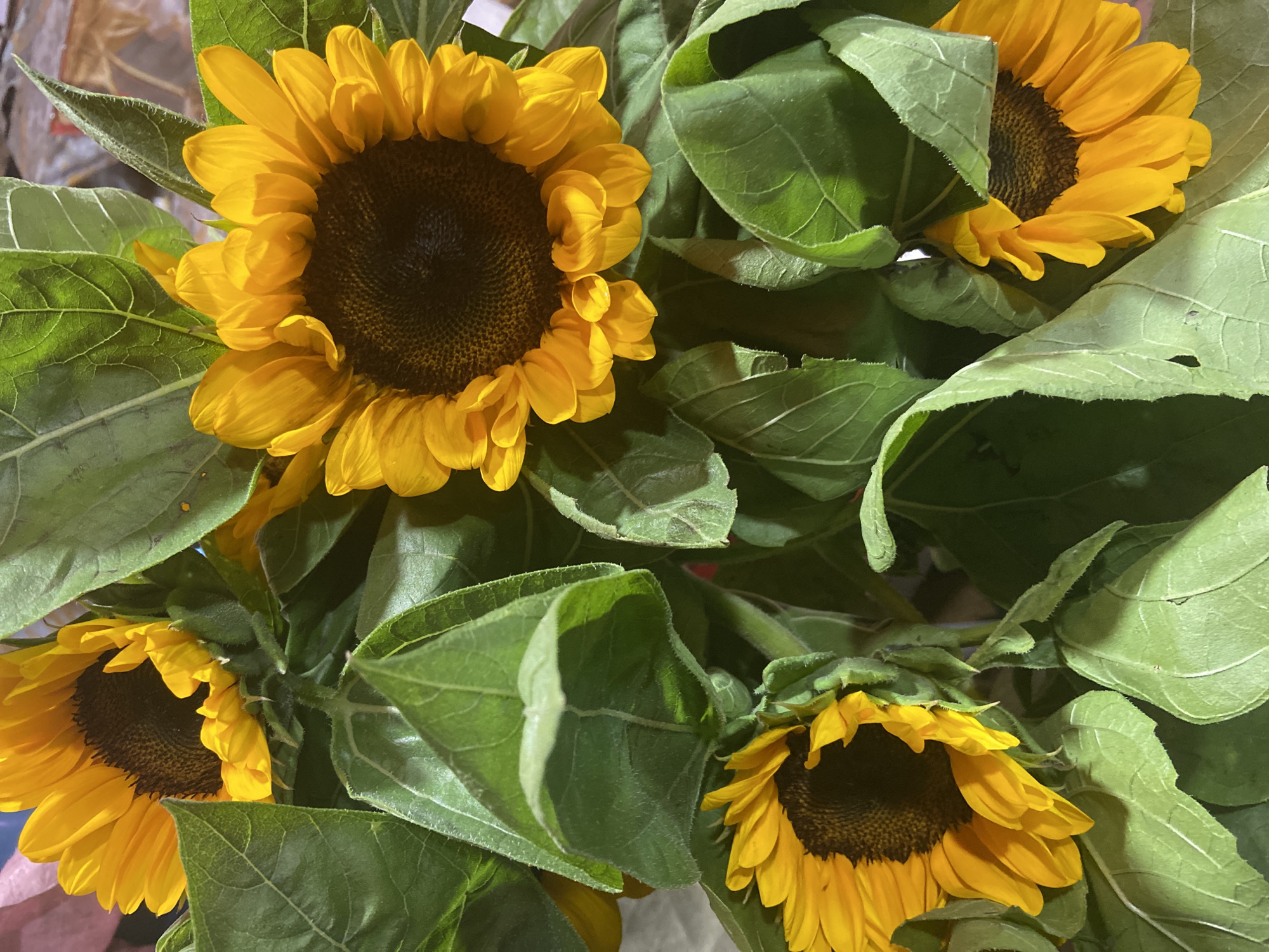 close-up view of a bouquet of sunflowers