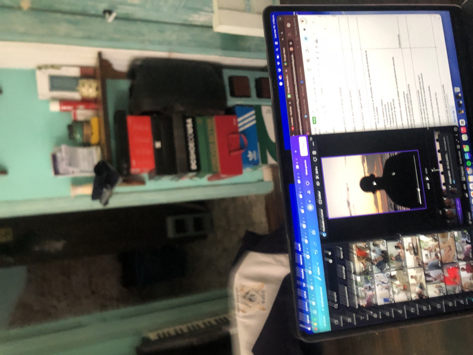 The image depicts an indoor scene in Beccar, Argentina, captured from the perspective of a user situated before an open laptop. The laptop screen, occupying the foreground, displays a web browser with multiple tabs, including what appears to be YouTube and Google Maps. Prominently featured is a video editing interface, showing a vertical video preview of a silhouetted individual wearing a hat against a sunset or sunrise over water. To the left of the preview, a grid of smaller video thumbnails is visible, indicating a project timeline or media library. The background reveals a room with light teal-painted walls. A wooden shelf on the wall holds several objects, including various bottles, a yellow container, and a white-framed item. Below the shelf, a stack of shoe boxes is arranged, with discernible brands such as "DC SHOECOUSA" and "ADIDAS." Adjacent to the stack, a black bag or container rests on a dark stool. To the left, an open doorway leads into a dimly lit interior where a cinder block is visible on the floor. Partially visible on the far left is a segment of a keyboard-like musical instrument, and beneath it, a white and dark blue garment adorned with a crest featuring a symbol resembling a square and compass. No human figures are present within the physical scene.