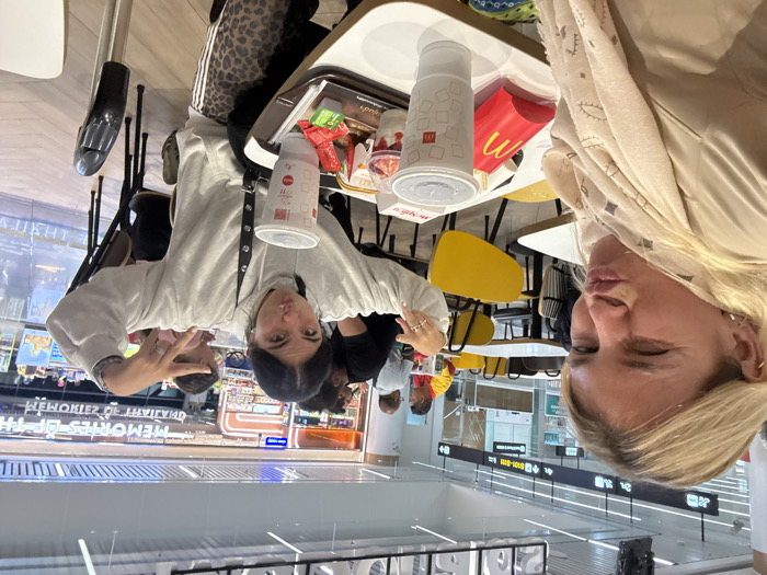 - "The image presents two women seated at a white table in a brightly lit, modern food court, identified as likely being within an airport terminal in the Nong Prue Subdistrict area of Thailand, potentially U-Tapao Rayong-Pattaya International Airport, based on background signage partially displaying "MEMORIES OF THAILAND" by FM-ohidB3, licensed under CC BY 4.0
