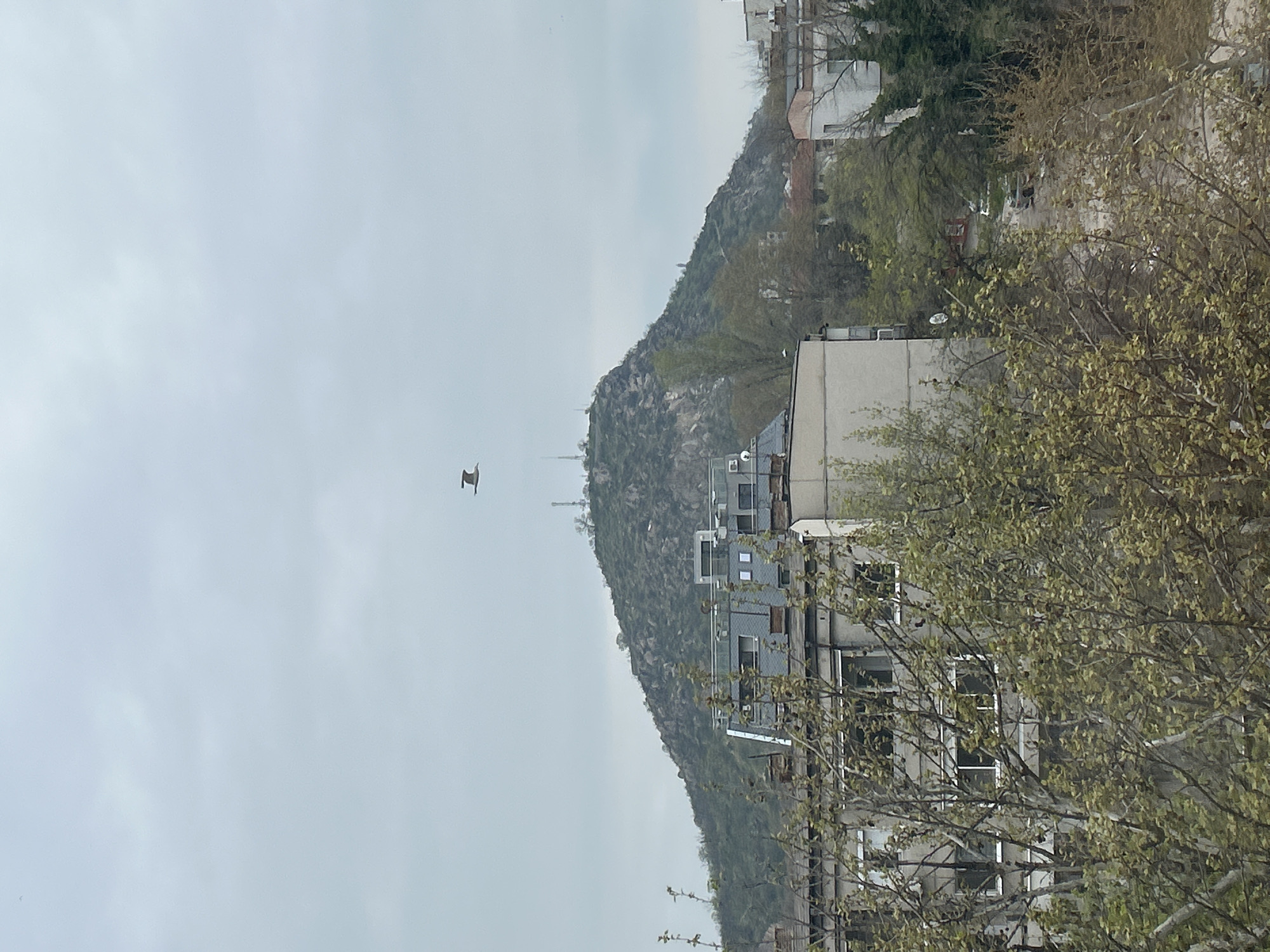 view in Plovdiv, Bulgaria, featuring the Dzhambaz Tepe hill. A building is in the foreground, partially obscured by tree branches with budding leaves. The hill rises behind the building, with some sparse vegetation and rocky outcrops visible. Several towers stand on the hill. A bird is flying in the sky to the left of the hill. The sky is overcast.