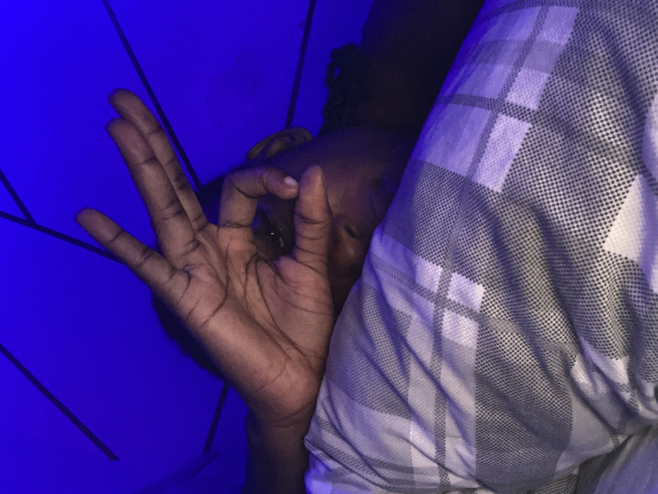 The image features a person in bed, partially obscured by a grey and white plaid duvet. Only the individual's face is visible, along with a hand making an "OK" symbol. The background is a vibrant blue with geometric linear patterns. The lighting casts a bluish hue on the scene, contributing to the overall mood.