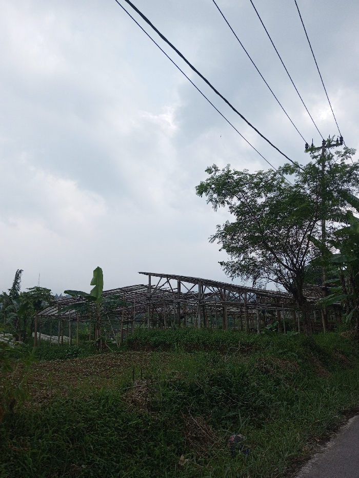 The scene is set in Sandamal Eliya, Sri Lanka, depicting a landscape under an overcast sky. The foreground features dense green vegetation and tall grasses on a sloping terrain, with a segment of dark asphalt road visible on the lower right. In the mid-ground, a large, skeletal wooden structure, identified as a possible greenhouse frame or incomplete building, spans horizontally. This structure consists of numerous wooden posts and beams supporting an unclad roof framework. To the right of this structure, a mature tree with dense green foliage stands beside a wooden utility pole equipped with insulators. Multiple dark power lines extend horizontally across the upper portion of the frame from this pole. Several banana plants, characterized by large green leaves, are interspersed throughout the vegetation, particularly one prominent plant in the mid-left foreground of the wooden structure. A patch of cleared, brownish earth is visible beneath the wooden structure. No individuals or active subjects are depicted.