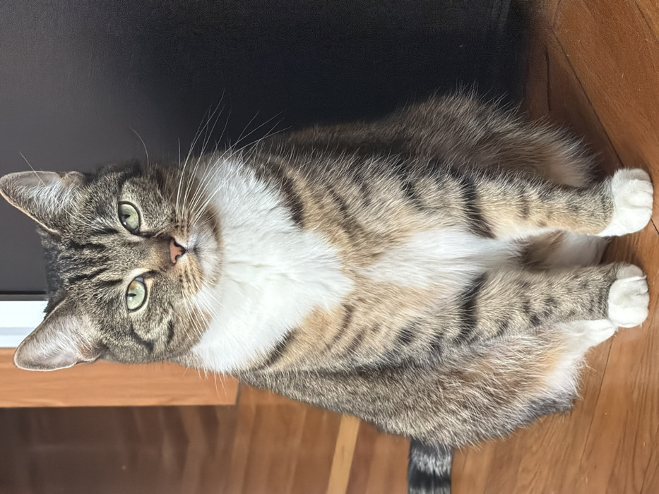 - "A domestic short-haired cat is observed sitting upright on a polished wooden floor" by FM-s9xhH3, licensed under CC BY 4.0