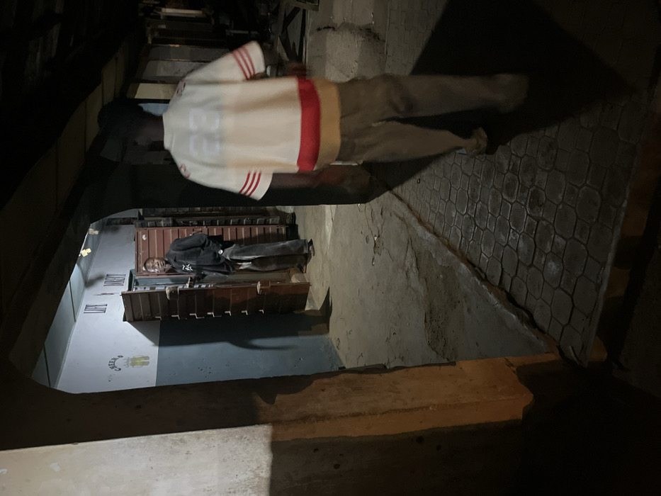 A dimly lit scene shows two people. One stands in a white and red striped shirt, facing away. Another is lying on what appears to be a makeshift bed made of stacked crates or boxes, inside what looks like a concrete structure. The setting suggests an impoverished or informal living situation, possibly an alleyway or a temporary shelter. The overall mood is somber and the location unkempt.