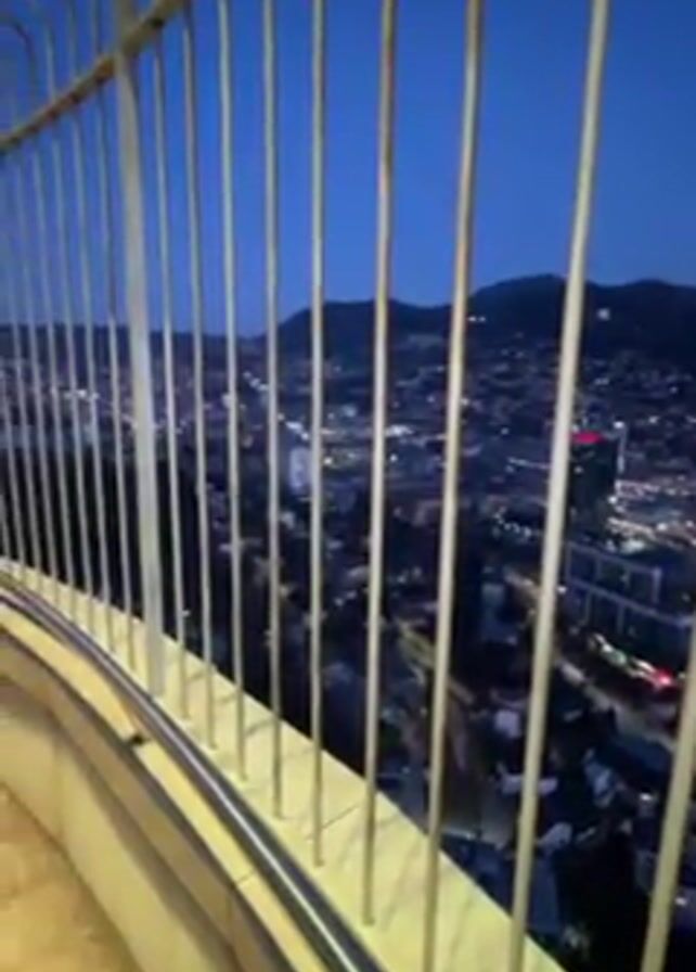 nighttime view of a city from a high vantage point, likely a tower or tall building. A metal railing runs along the edge of the platform. The city lights twinkle below, and mountains are visible in the background under a dark blue sky. A person wearing a beige hat, light-colored vest, and patterned pants walks into the frame and stands near the railing, looking out at the city.