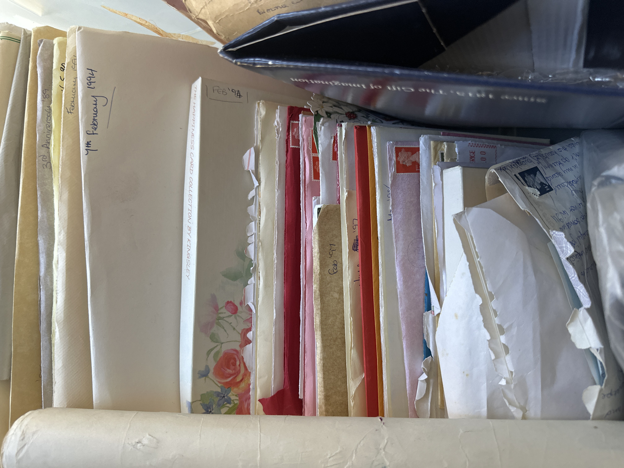 The image displays a close-up, top-down view of a collection of stacked envelopes, cards, and papers. The specific location within Wealden, United Kingdom, cannot be determined from the visual evidence. The scene features numerous documents, primarily light-colored envelopes, vertically arranged within what appears to be a storage box or compartment. A tightly rolled, light-colored object, possibly paper or fabric, occupies the left margin. Hand-written dates are visible on several envelopes, including "3rd Anniversary '89", "February '90", "4th February 1994", and "Feb '97". One card, visible upside down, reads "THE HAPPINESS CARD COLLECTION BY KINGSLEY". Several items are colored, with prominent red and pink envelopes or cards among the stack. Postage stamps are visible on some envelopes: a red stamp with Queen Elizabeth II's profile marked "1ST", another red stamp, and a blue stamp showing "14P". On the right side, a dark blue or black binder is partially visible, displaying "The Gift of Imagination" on its spine. Behind this binder, a brown paper-wrapped object is partially observable. The papers exhibit varying states of preservation, with some showing creases, tears, and discoloration consistent with age. No individuals are present in the frame.