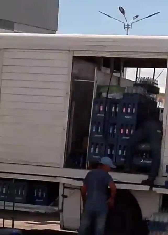 several street scenes. The first features a small silver car behind a white box truck. The second shows a truck parked in front of a building with a sign that says "Licores Encrucijada." A man is seen near the back of the truck. The third shot shows a building with a sign for "Cerveza Zulia Max Market." A man is walking into the store. There are two motorcycles parked in front, as well as a black car. The fourth shot shows the front of a light blue and white van. The last shot shows the street again, with the white box truck and a small silver car, as well as other vehicles passing by. The sky is clear and blue in most shots.