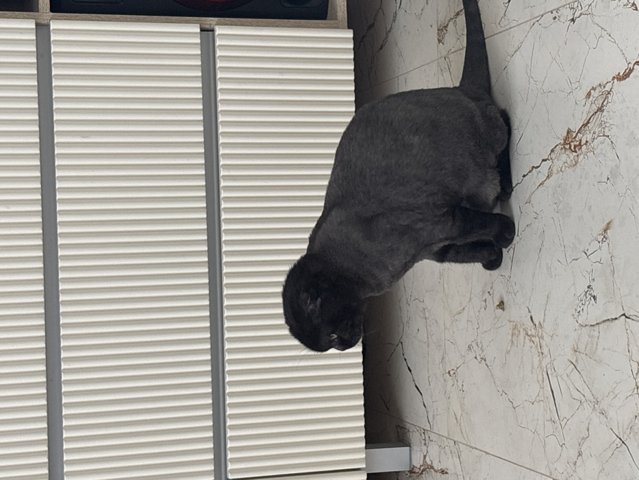 - "An indoor setting in Нестюково, Russia, features a dark grey or black domestic cat, possibly a Scottish Fold, sitting upright on a light-colored, veined marble or tiled floor" by FM-xlahD2, licensed under CC BY 4.0