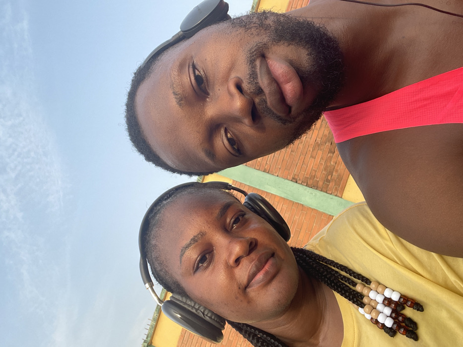 Two people are captured in a close-up, tilted shot. The person at the top, a man, has a beard and wears headphones and a red top. The person below, a woman, also wears headphones and a yellow shirt. Her hair is braided, adorned with beads. The background appears to be outdoors, with a glimpse of a wall and sky visible.