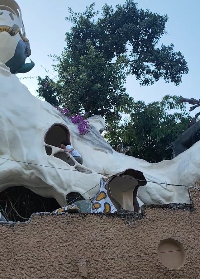 Two men are on top of a surrealist, organic-shaped structure
