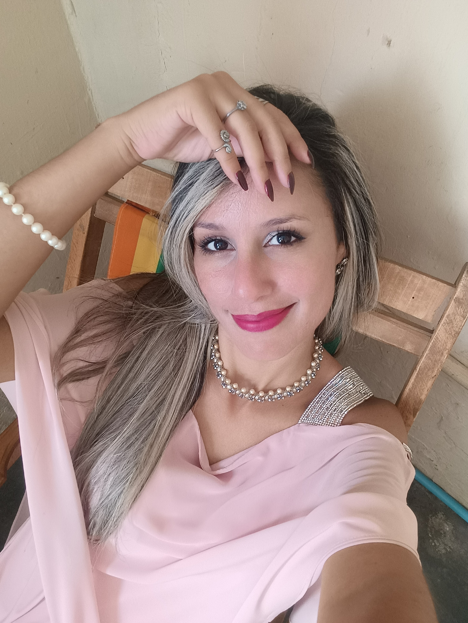 A woman is seated indoors, wearing a light pink dress, a pearl necklace, and rings on her left hand. Her left hand is raised to her forehead. She is smiling and looking at the camera. The background shows a wall and part of a wooden chair. The location is not evident from the image; it does not provide specific details to identify it as Las Tejerías, Venezuela, or any other particular city.