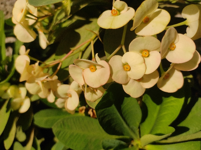 A close-up photograph captures a section of a *Euphorbia milii* plant, commonly known as Crown of Thorns, situated in a cultivated outdoor environment in Abuja, Nigeria. The scene is dominated by multiple clusters of pale yellow to cream-colored bracts, each featuring a prominent bright orange-yellow central cyathium. Some bracts exhibit subtle pinkish margins. Dark green, ovate-shaped leaves are interspersed throughout the frame, with some appearing in sharp focus and others providing a blurred background. Slender stems with a reddish-brown hue are visible supporting the foliage and floral structures. Natural light illuminates the plant, casting soft shadows on various leaves and emphasizing the texture and color of the flowers. No people or interactions are visible.