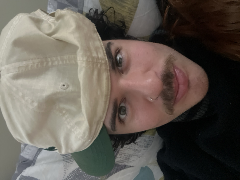 An individual, appearing to be a young adult male, is depicted in a close-up portrait. The location is an undetermined indoor setting in the city of Unknown, Unknown. The individual has dark, curly hair, greenish-brown eyes, and a prominent mustache. A silver hoop piercing is present in his left nostril. He wears a two-tone baseball cap with a light beige crown and a dark green brim, positioned slightly pushed back on his head. A dark turtleneck garment is visible around his neck, along with a dark, possibly textured outer layer. He maintains direct eye contact with the camera, exhibiting a slight smile. The background consists of patterned bedding or fabric, featuring white and grey designs on the left side, and a solid brown or reddish-brown fabric on the right. The scene is illuminated by soft, diffused lighting.