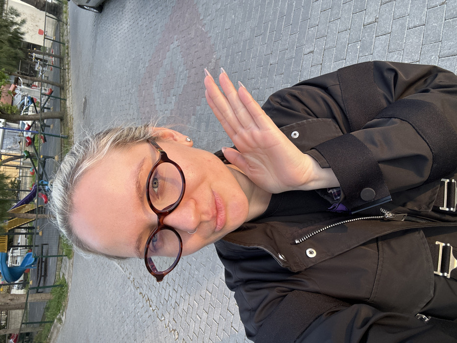 A female subject, estimated to be between 20 and 40 years old, is depicted in an outdoor setting in Fethiye, Turkey. She has light-colored hair, wears dark brown oval-framed eyeglasses, a silver nose ring on her left nostril, and a small silver heart-shaped earring on her right earlobe. She is dressed in a black jacket featuring a central zipper, multiple snap buttons, and two silver buckle-like fasteners at the lower front, over a black t-shirt. Her left hand is raised, palm facing the camera, positioned adjacent to her chin, displaying long, clear-tipped manicured fingernails. Her gaze is directed at the camera with a subtle smile. The ground beneath her is paved with interlocking grey and red pavers. In the background, to her left, is a children's playground with blue and yellow slides and other equipment, enclosed by a dark fence. To her right and further back, an outdoor gym with various metal exercise machines is visible. Trees line the background, and a silver vehicle is partially visible on the far right. The scene is illuminated by warm, directional sunlight, consistent with either early morning or late afternoon.