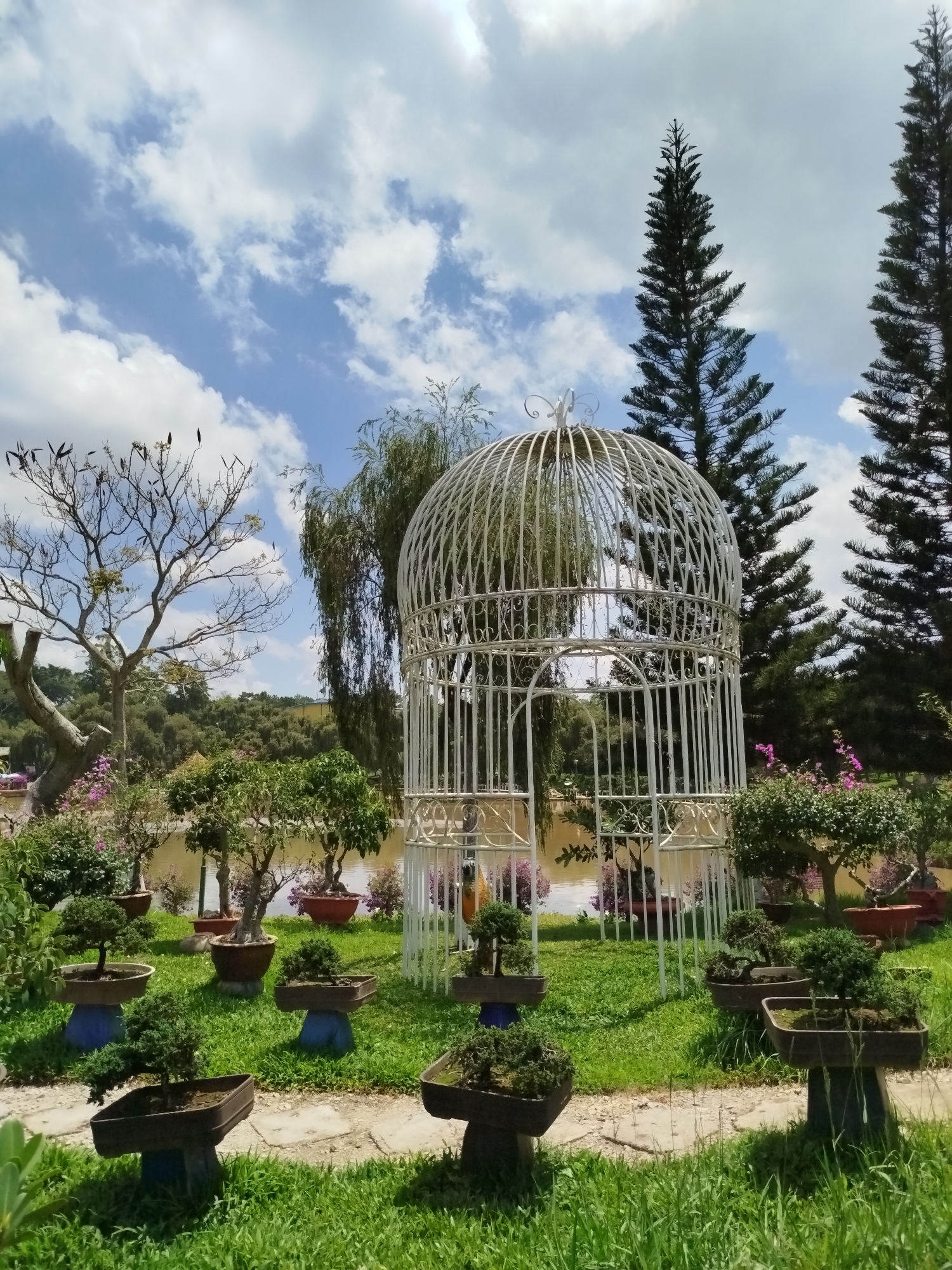 garden in Lâm Viên - Đà Lạt, Vietnam. In the foreground are several bonsai trees in pots, arranged on stands or directly on the ground. The background features a large, white, domed birdcage-like structure. Behind that, there's a body of water (likely a lake) with various trees and vegetation along its banks. In the distance are tall evergreen trees. The sky is blue with scattered white clouds.