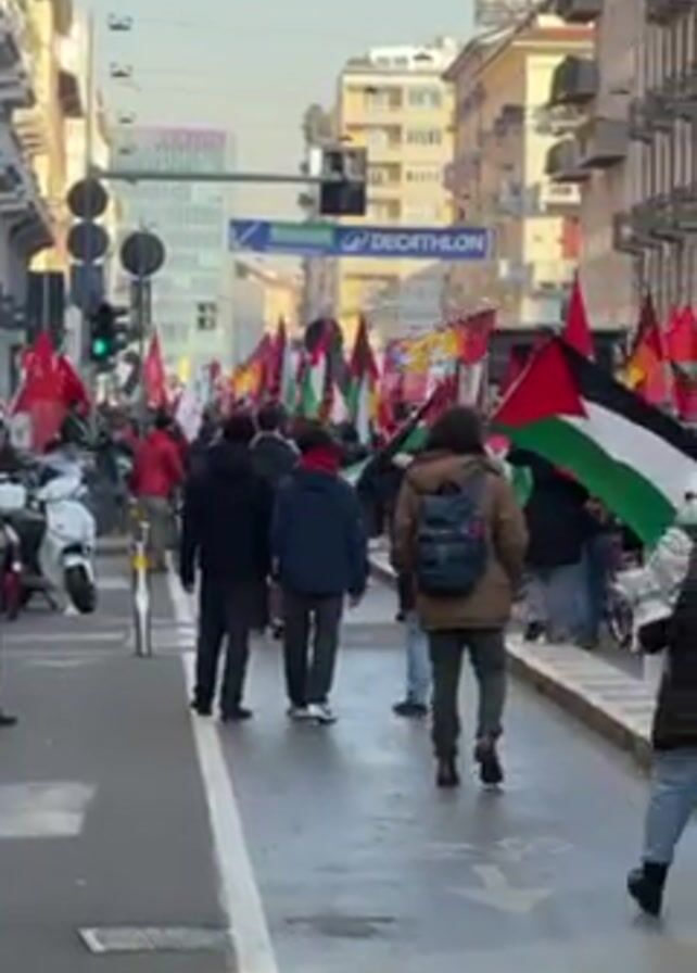 A group of people are walking down a city street in broad daylight carrying flags. The flags include those of Palestine, as well as red flags with symbols and logos. The street has buildings lining both sides, with sidewalks and parked motorcycles. A Decathlon store sign is visible. The group appears to be part of a protest or march. Some people are wearing winter coats and hats. A traffic light is visible and appears to be green. The road is wet and there is a white line dividing the road.