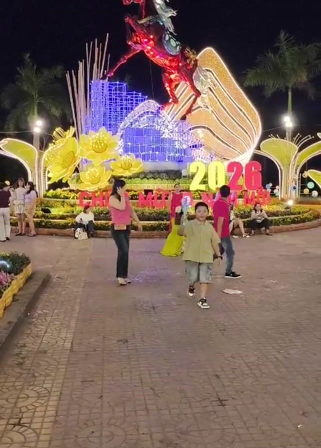 At night, a low-angle shot captures a bustling public space. A brightly lit display takes center stage, featuring a stylized horse figure and the year "2026". The display is adorned with flowers and other decorative elements. People of varying ages stroll around, some taking photos. A girl with braided hair stands in the foreground, gazing at the display. A boy runs toward the camera. The ground is paved with interlocking bricks. Palm trees punctuate the background, their silhouettes barely visible against the dark sky.