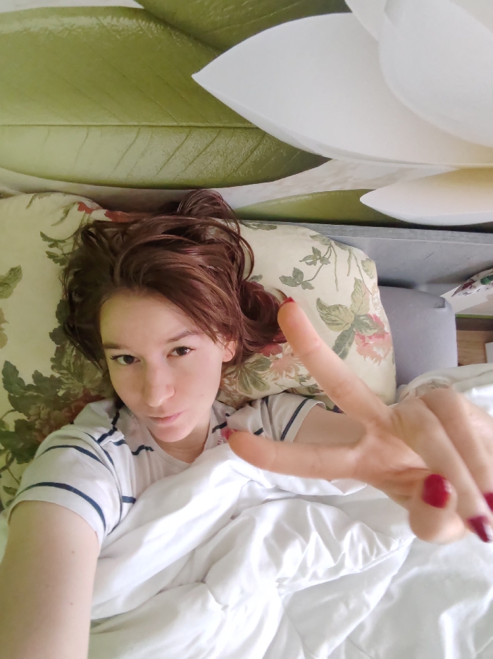 A woman lies supine in a bed, her head resting on a light-colored pillow adorned with a floral pattern of green leaves and pink blooms. Her reddish-brown hair is disheveled, fanned out on the pillow. She wears a white t-shirt with thin dark horizontal stripes. Her left arm is raised, and her hand displays a "peace" sign (V-shape), with dark red nail polish visible on her fingernails. A white duvet or blanket covers her body from the chest downwards. The immediate background above her head features a wall decoration with large green leaf motifs. To the upper right, a large white decorative element, possibly a light fixture or wall art, resembling a multi-petaled flower, is visible. The scene is located indoors, presumably a bedroom, in the city of Unknown, Unknown.