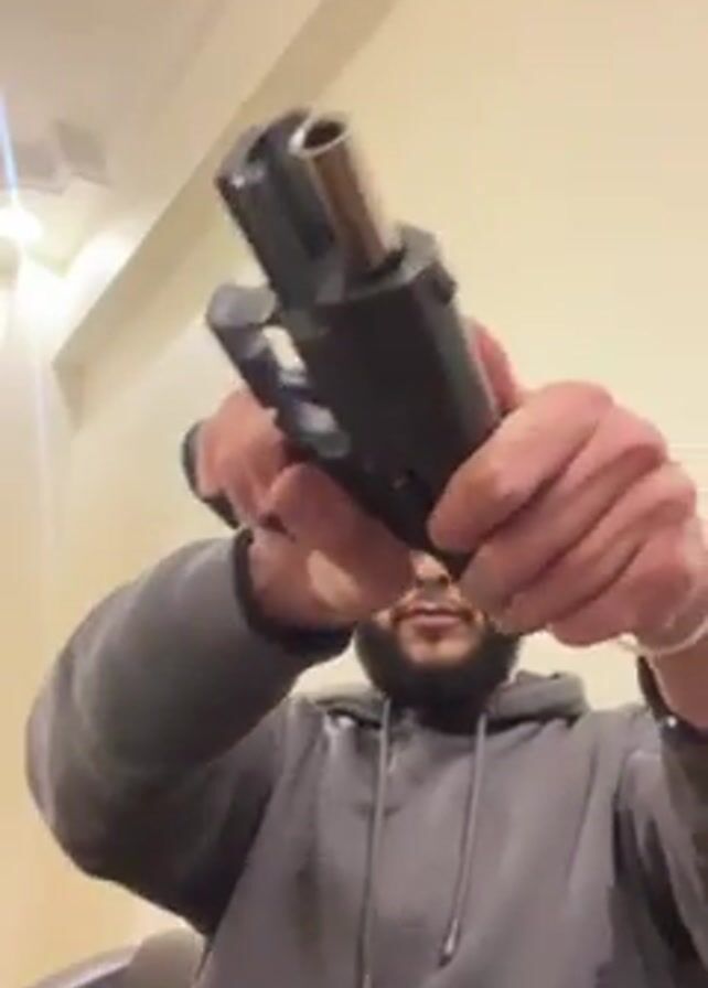 A man with dark hair and a beard is holding a black handgun