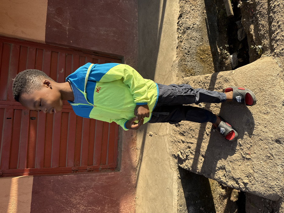 A young, dark-skinned male, estimated between 6 and 10 years of age, stands outdoors in Jos, Nigeria. He is dressed in a two-tone windbreaker jacket, featuring neon yellow-green on the lower half and blue on the upper half with a matching hood, a white zipper, and a "Millet" brand logo on the left chest. A light blue t-shirt is visible beneath the jacket. He wears dark blue cargo pants and black sandals with red soles, marked "SPORT" in white text on the strap, and an "Adidas" logo partially visible on one strap. The boy is positioned slightly to the right of the frame, with his head turned to the right, mouth slightly open, and hands loosely clasped at waist level. He stands on a rough, light grey concrete or stone step. Directly behind him is a building wall, painted dark reddish-brown on the lower portion and lighter reddish-orange above, with a closed, dark red, horizontally-slatted door or window. To the boy's right (viewer's left), an open drainage ditch with dark water or debris is visible below the concrete step, bordered by rough earth. The scene is illuminated by strong, low-angle natural sunlight, casting distinct shadows.