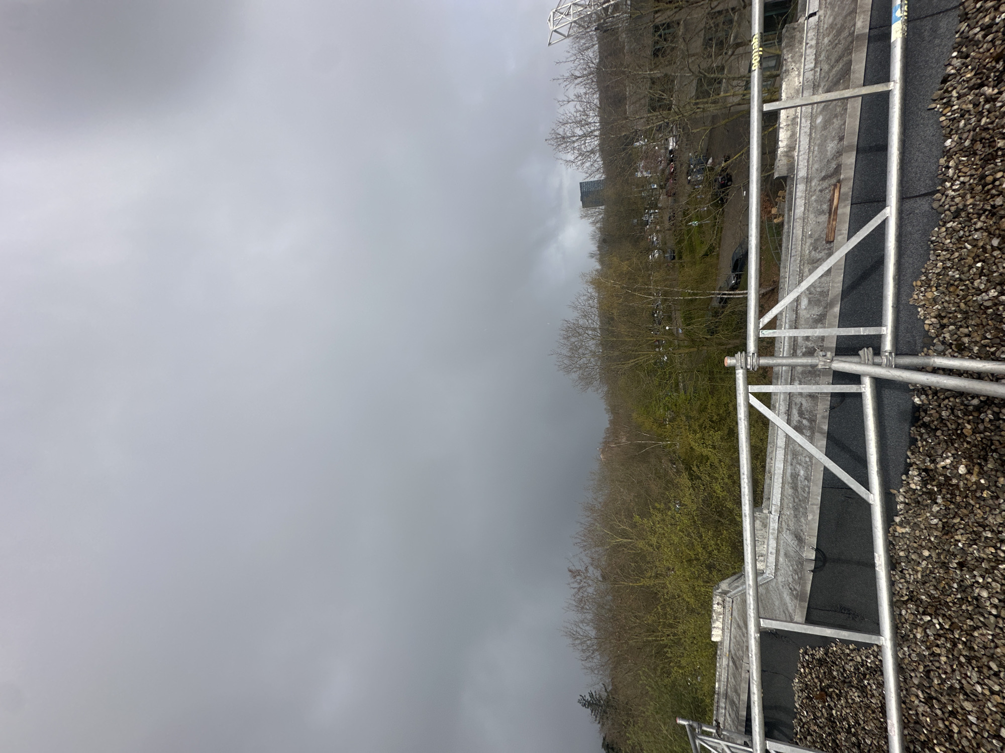 An elevated perspective from a gravel-covered flat roof under an overcast, uniformly grey sky