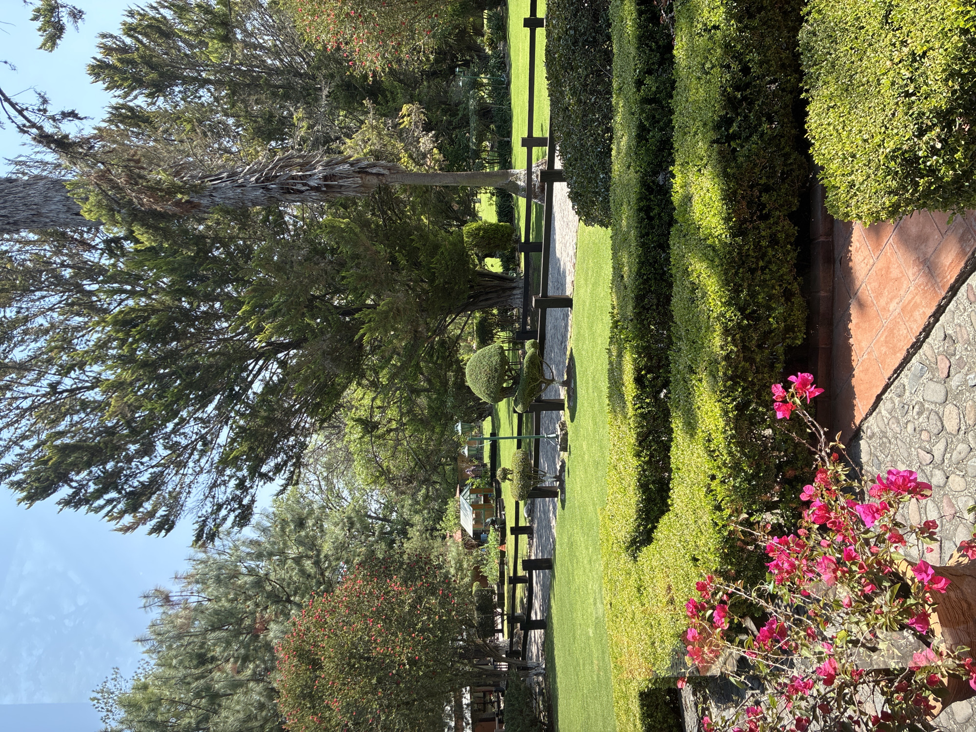 The image depicts a garden scene in Cañada de Madero, Mexico. A manicured lawn extends between trimmed hedges and a wooden fence running parallel. Topiary trees are visible along the path. In the foreground, a flower pot with pink bougainvillea contrasts with the green foliage. The background features larger trees with a glimpse of a building structure. The image appears to have been taken on a clear, sunny day, casting shadows across the lawn and path.