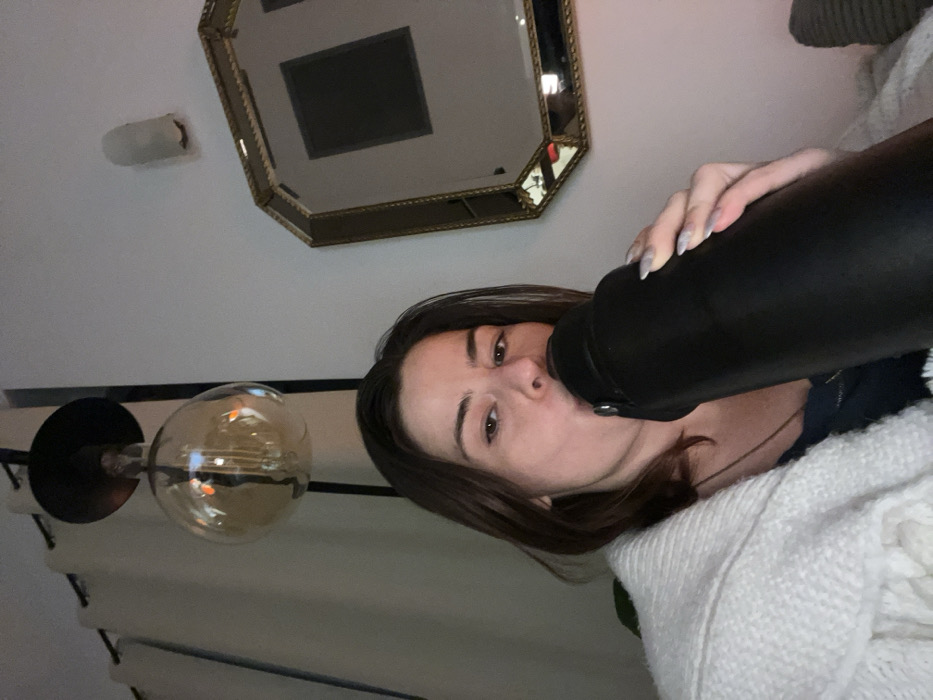 A woman drinks from a large, black water bottle, nearly obscuring her face. She is wrapped in a chunky, white knit sweater. A decorative mirror with a gold frame hangs on the wall behind her, reflecting a dark square. To the left, a modern light fixture with a large, spherical bulb is visible. The image is rotated, positioning the ceiling on the left side.