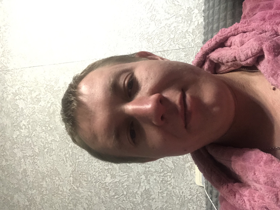 An adult male is depicted in a close-up, head-and-shoulders shot, looking directly into the camera with a neutral expression. He has short, light brown hair and fair skin, with slight redness around the nose and minor facial blemishes. He is wearing a pink, textured, possibly fleece material robe, visible draped over his shoulders and upper chest, suggesting an indoor setting. A thin metallic chain is visible around his neck. The background consists of an interior wall; the left portion features a light-colored, textured surface resembling stucco or heavily patterned wallpaper, while the right portion appears to be a plain white surface. A small, light-colored rectangular object with an attached white cable extending downwards is visible on the textured wall to the left of the individual's head. The image is taken from a slightly low angle, indicative of a self-portrait. The scene is located indoors within Chaikovsky, Russia; however, specific coordinates or distinguishing architectural features within the city are not discernible from the provided image.