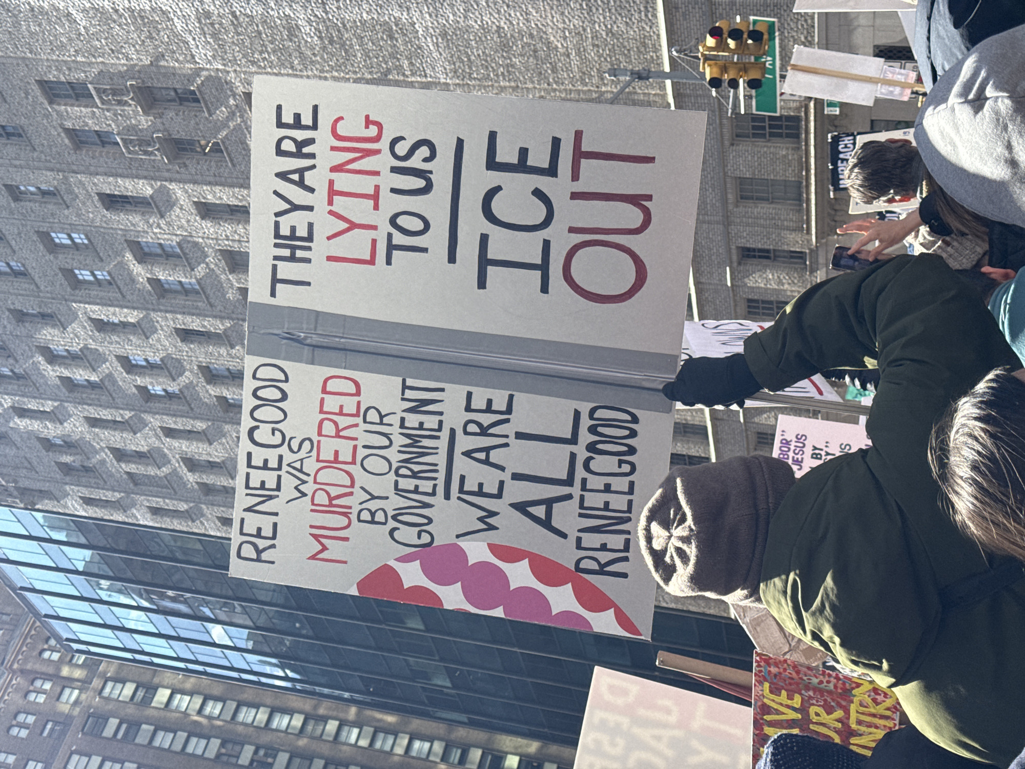 political protest rally in the city of New York, United States of America. Two signs are visible, one reads "RENEE GOOD WAS MURDERED BY OUR GOVERNMENT WE ARE ALL RENEEGOOD", and the other reads "THEY ARE LYING TO US ICE OUT". People are carrying the signs in front of a building. There is a traffic light in the background.