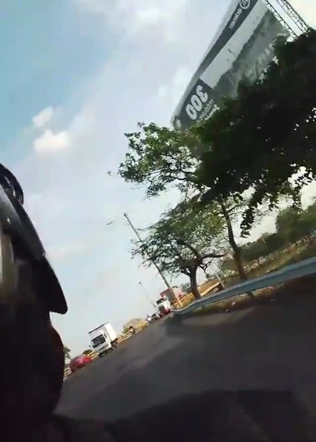 A first-person perspective video appears to be taken from a moving vehicle, likely a motorcycle, based on the visible helmet