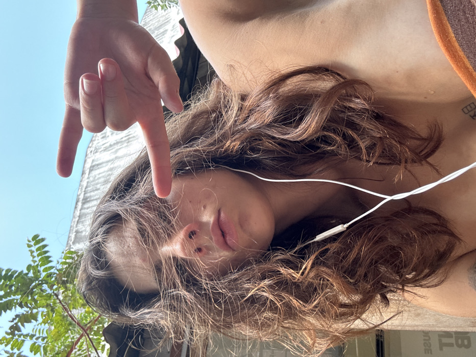 A close-up, low-angle shot captures a person with long, wavy brown hair, partially obscuring the face, outdoors in Chiang Mai City Municipality, Thailand, under a clear blue sky. The individual has tan skin and is wearing white wired earphones. The left hand is raised to the upper right of the frame, performing a "rock and roll" gesture with the index and pinky fingers extended. A dark tattoo, featuring East Asian characters, is visible on the left torso/ribcage. The person appears shirtless or in minimal upper attire, with an orange and brown striped garment visible at the lower right. The background includes green foliage from a tree on the upper left, and a weathered, light-colored building wall or roof, possibly corrugated metal, spans the upper right. Faint, reversed text is visible on a surface in the lower-left background. Strong daylight illuminates the scene.