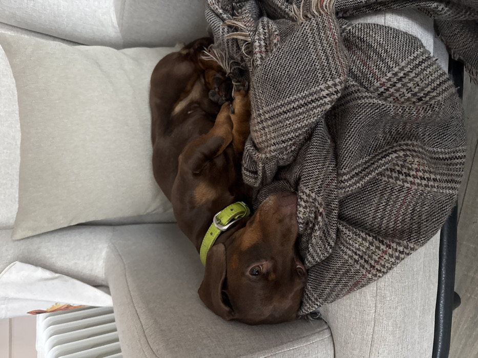 - "An indoor scene in Zelenogradskiy, Russia, depicts a single short-haired dachshund dog resting on a light gray upholstered armchair" by FM-xqHZp2, licensed under CC BY 4.0