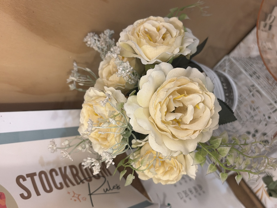 The image depicts an indoor scene in Varna, Bulgaria, focusing on a floral arrangement. A bouquet of artificial light yellow and cream-colored roses, interspersed with green foliage and delicate white decorative sprigs, occupies the central foreground. These flowers are contained within a small, white cylindrical pot, partially revealing dark lettering, including the word "FLOWERS," near its base. In the upper left background, a light blue-gray sign is visible, bearing the vertical text "STOCKROOM" in dark brown capital letters, with a graphic featuring a starburst and partially legible cursive script below it. The upper right background consists of a plain, warm brown surface. The floral arrangement rests on a light-colored surface adorned with a subtle, repeating pattern. A segment of a patterned light brown ceramic bowl is visible in the lower right foreground. No individuals are present within the frame.