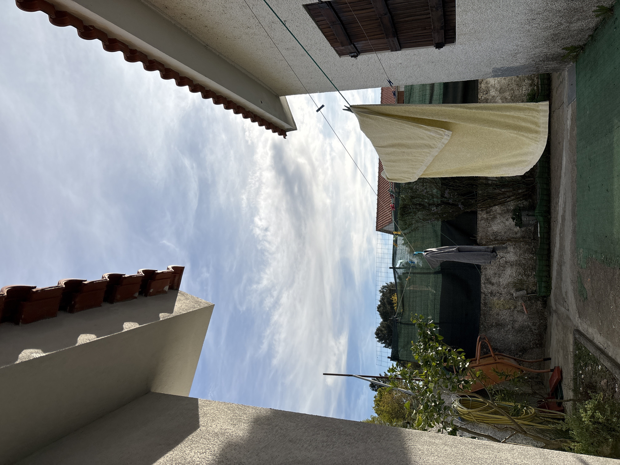 The image depicts a narrow courtyard view in Vila Real, Portugal. The perspective is looking up at the sky between buildings. The courtyard contains plants, a hose, a wheelbarrow, and miscellaneous gardening tools. Clotheslines are strung between buildings with clothing hanging to dry. The buildings have tiled roofs and textured exterior walls. Wooden shutters are visible on one of the buildings. The sky is cloudy with blue patches. The environment appears to be a residential area.
