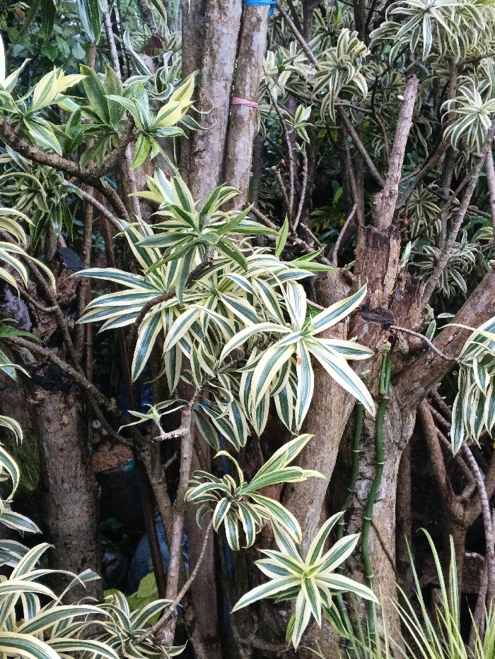 The image displays a dense botanical scene, located in Pea Reang District, Cambodia. The foreground and midground are populated by numerous variegated plants, characterized by elongated, lanceolate leaves featuring prominent central green stripes bordered by creamy yellow margins. These leaves are arranged in rosettes or spirally along visible woody stems. Behind the foliage, a dense network of vertical, brown, textured tree trunks and branches forms the background. A thin pink plastic band is secured around one of the central tree trunks. Higher on an adjacent trunk, a blue plastic band is partially visible. A dark, possibly terracotta or plastic, container or pot is dimly discernible amongst the lower foliage to the left. No individuals, animals, or explicit actions are depicted.