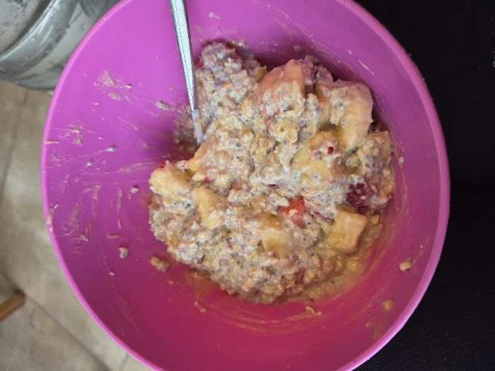 A magenta plastic bowl containing a creamy food mixture is depicted from a high-angle perspective. The mixture consists of a base resembling oatmeal or porridge, densely interspersed with small, dark, possibly chia seeds, and irregularly cut chunks of yellow fruit, consistent with banana or apple. Smaller fragments of red fruit are also visible throughout the mixture. A silver-colored spoon is partially submerged within the food on the right side of the bowl. Streaks and residue of the food adhere to the inner walls of the bowl, suggesting prior consumption or stirring. The immediate foreground beneath the bowl is an indistinct dark surface. The blurred background reveals a light brown object, possibly a wooden furniture leg, in the upper left, and a metallic, cylindrical object with a textured surface in the upper right. The scene is situated in the city of Gevgelija, North Macedonia.