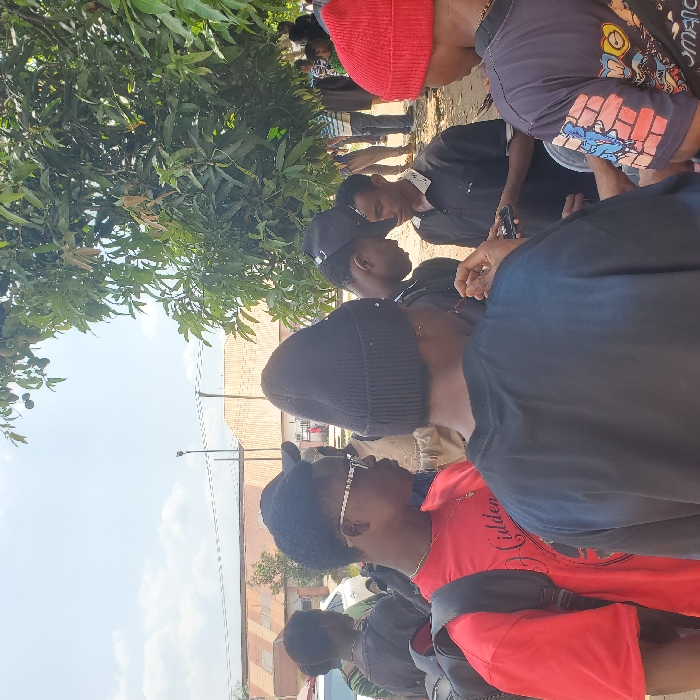 A group of young men huddle outdoors on a sunny day, seemingly engrossed in something they are watching or discussing. One wears a red t-shirt, another a red beanie, and a third a black beanie. The others are mostly obscured, but appear to be wearing dark clothing and hats. Trees stand to the left, and a building with a tan roof can be seen in the background.