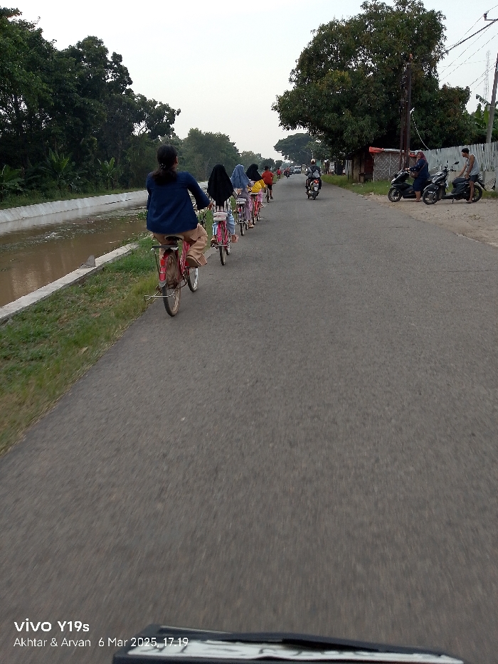 A group of seven people, mostly women, are riding bicycles on a paved road. The road has a canal on the left side. The people are facing away from the camera. The lead cyclist is a woman wearing a blue jacket and beige pants. She is riding a red bicycle with a white seat. The others are dressed in long sleeves and pants. The canal is partially filled with water. The camera is mounted on a moving vehicle. There are some trees on the left side of the road and some more trees and houses on the right. The road appears to be in Kecamatan Gabuswetan, Indonesia.