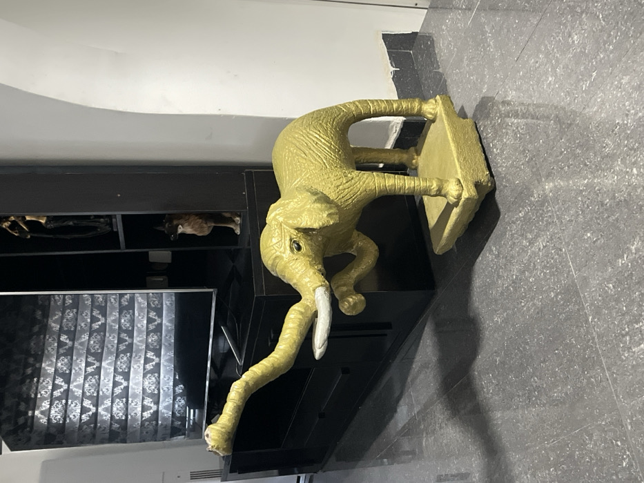 The scene is an interior view within a residence in Lokoja, Nigeria. A prominent, golden-painted elephant statue stands in the foreground, positioned on a rectangular golden base atop a dark gray, speckled tiled floor with visible grout lines. The elephant sculpture features a raised left foreleg, an extended and upward-curved trunk, and two short white tusks. In the background, a black entertainment console supports a flat-screen television, which reflects a silver and black patterned window blind. To the right of the television, a tall, dark open-shelf unit displays a dark, slender figurine on its upper shelf and a brown, quadrupedal animal figurine, resembling a dog, on a lower shelf. A white wall with a partial archway is visible on the far right. No individuals are present in the depicted environment.