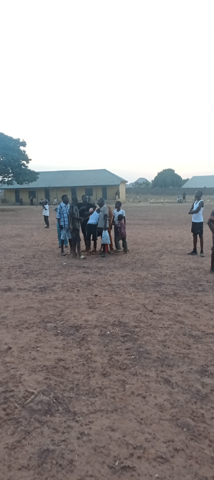 A group of people stands huddled on a dirt field under a cloudy sky. Some appear to be children. Buildings with light-colored walls and dark roofs stand in the background, and a few individuals are visible near them. The ground is dry and uneven, marked with patches of darker soil and sparse vegetation. One person stands off to the side with arms crossed. The overall setting appears rural.