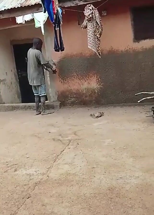 A man in a gray shirt and shorts walks on a concrete patio in front of a building with an open door. He carries a small metal pot and what looks like red cloth in his hands. He bends down to the ground. Above him, hanging from a clothesline, are articles of clothing, including a blue and red garment and a colorful wrap. The building has a tin roof. To the side of the man is a patch of uneven mud or plaster on the building’s wall. A small clump of debris is on the ground.