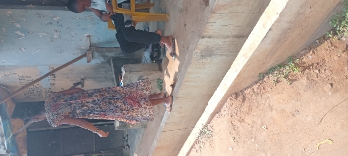 This image depicts an outdoor street scene in Aba, Nigeria, under daylight conditions. The foreground features a concrete drainage culvert running horizontally, separating a reddish-brown dirt path from a slightly raised area adjacent to a building. Scattered small green plants are visible along the base of the culvert. Two individuals are present. On the left, a young person, likely female, with dark hair styled in braids, stands barefoot on the concrete edge of the culvert. She is wearing a sleeveless, long dress with a multi-colored pattern and a silver bracelet on her left wrist. Her back is mostly to the viewer, and she faces slightly to the right. Further back, near the building wall, a pair of black slip-on shoes are visible. To the right, another individual, also likely female, with dark hair, sits on a yellow plastic chair. She is wearing a light-colored top and dark trousers, and her feet are bare. She is leaning forward, focused on an object held in her hands. A black slipper is near her feet. The background consists of a weathered, light blue-grey building wall with peeling paint. A handwritten sign in white paint is visible on the wall, partially obscured, reading "SANECO ELECTIC RE STORE SELL & SERVICES" followed by a partial phone number "081...". An awning, possibly made of light-colored fabric or tarp, extends from the building, supported by two visible wooden poles that lean against the wall. The ground directly behind the culvert and near the individuals is also reddish-brown earth, with some debris and small objects scattered.