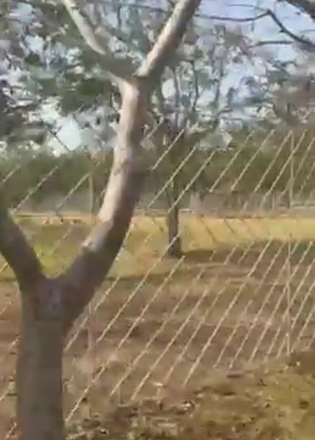 The camera moves past a chainlink fence, revealing a grassy area with trees in the background