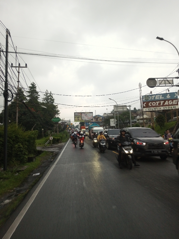 The image depicts a congested roadway under an overcast sky, with the asphalt surface appearing wet, indicating recent precipitation or high humidity. The scene is identified as Dawathang_Dorjibi_ Kashingtsawa, Bhutan, although a prominent commercial sign within the frame reads "HOTEL & COTTAGE CISARUA INDAH", which is geographically associated with Indonesia. **Environment:** The sky is uniformly grey and cloudy. On the left side of the two-lane road, dense green foliage, including bushes and tall trees, lines the roadside. A utility pole heavily laden with numerous tangled black electrical wires stands prominently on the left. The road itself is dark grey, wet, and shows reflections of vehicle lights. In the mid-ground and background, buildings are visible nestled among hills and trees, characteristic of a mountainous or hilly urban/suburban environment. **Objects and Structures:** A white solid line delineates the left edge of the road, with a grassy verge and a smaller, partially obscured white sign (possibly a 'P' for parking) visible. Further along the left, a green sign with white text reading "Flower Seed Cafe" is positioned. On the right side, an overhead street light fixture is mounted on a pole. Below it, a large directional sign points left and displays "HOTEL & COTTAGE CISARUA INDAH" in white text on a dark background. Behind this, a billboard with "Mitra" and "20-26" visible, along with other commercial advertisements, stands above other structures. **People and Vehicles:** The road is heavily trafficked with a mixture of motorcycles and cars. Multiple motorcyclists are visible, all wearing helmets. In the left lane, at least three motorcycles are clearly seen, with one rider wearing a yellow jacket on a silver scooter and another on a dark scooter with its headlight illuminated. In the right lane, a dark-colored SUV (possibly a Toyota Innova, identifiable by its taillight design and a partial Indonesian license plate B 2598 BIV) with illuminated red taillights is prominent, with other cars and motorcycles behind it. Vehicles appear to be either stopped or moving slowly in traffic. Headlights and taillights are visible on several vehicles, suggesting low light conditions or active use during inclement weather. No pedestrians are clearly visible.