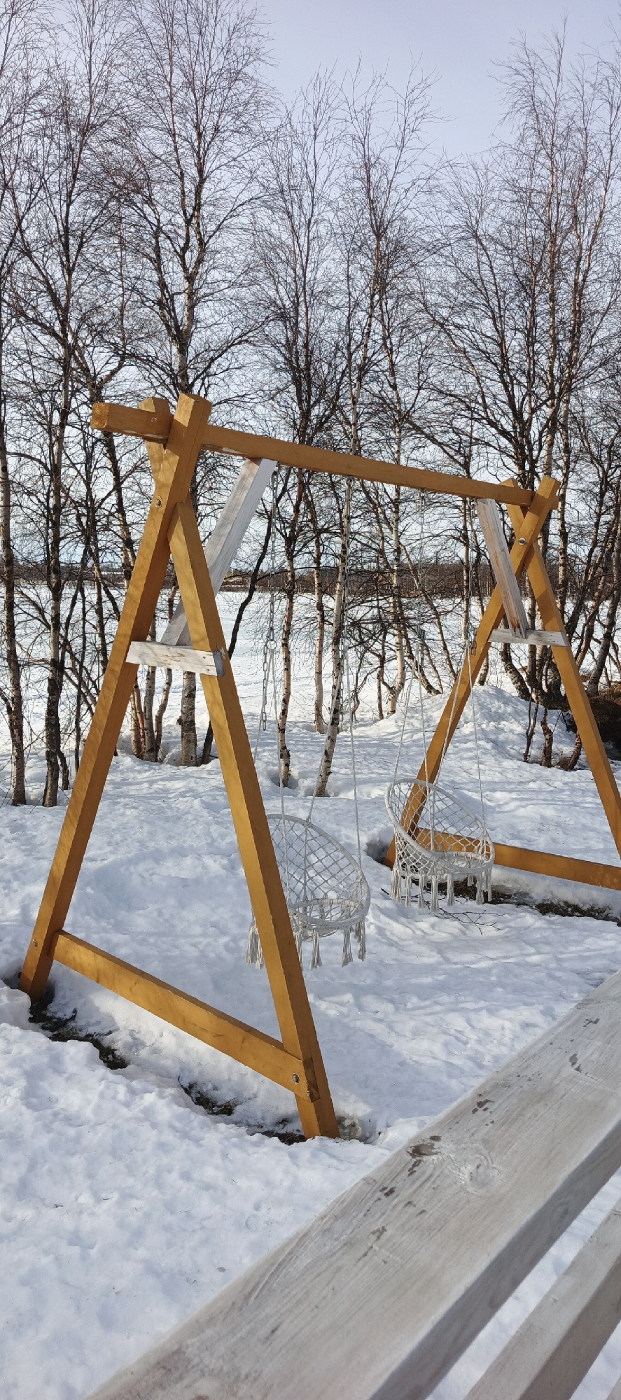 A wooden swing set with two macrame chair swings stands in a snowy landscape in what appears to be Iskateley, Russia