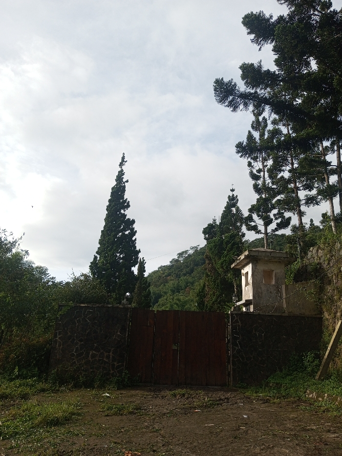 A weathered, gray structure with empty window frames stands near a stone and wood fence. Tall evergreen trees dominate the landscape, set against a cloudy sky. Lush green vegetation covers the surrounding hills. A dirt path leads up to the fence, suggesting an entrance to the wooded area. The scene is quiet and overgrown, giving a sense of abandoned tranquility.