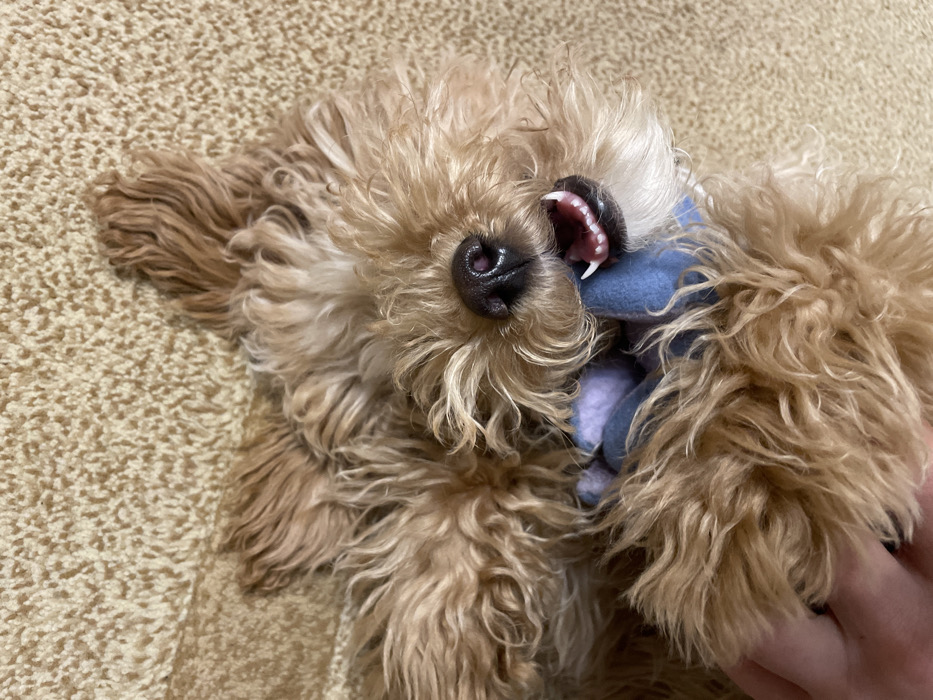 - "The image captures a small, light brown canine, likely a Poodle or Doodle breed, lying on its back on a beige, textured carpet, an interior floor surface within a residence in Aratashen, Armenia" by FM-4p9aD3, licensed under CC BY 4.0