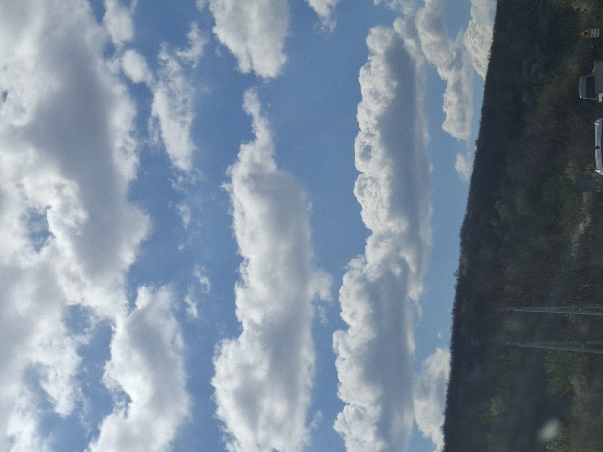 blue sky with streaks of cumulus clouds. On the right side of the image, there is a dark, blurry outline of a hill or mountain covered with vegetation, next to a blurry electrical tower. The image appears to have been taken from a moving vehicle on the road along a mountain. It is impossible to determine the location in Archar, Bulgaria from the image content.